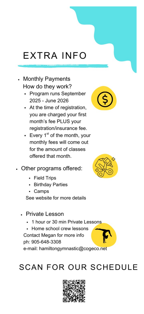 Hamilton Gymnastic Academy has been providing high quality gymnastic instruction to thousands of children in our community since 1981. Privacy Policy | Gymnastics Ontario Safe Sport Policies | Copyright © 2006 - 2025 Email: Info@HamiltonGymnastics.ca | Website: www.HamiltonGymnastics.ca Hamilton Gymnastic Academy