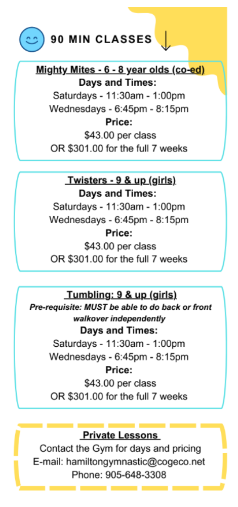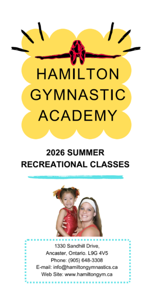 Hamilton Gymnastic Academy has been providing high quality gymnastic instruction to thousands of children in our community since 1981. Privacy Policy | Gymnastics Ontario Safe Sport Policies | Copyright © 2006 - 2026 Email: Info@HamiltonGymnastics.ca | Website: www.HamiltonGymnastics.ca Hamilton Gymnastic Academy